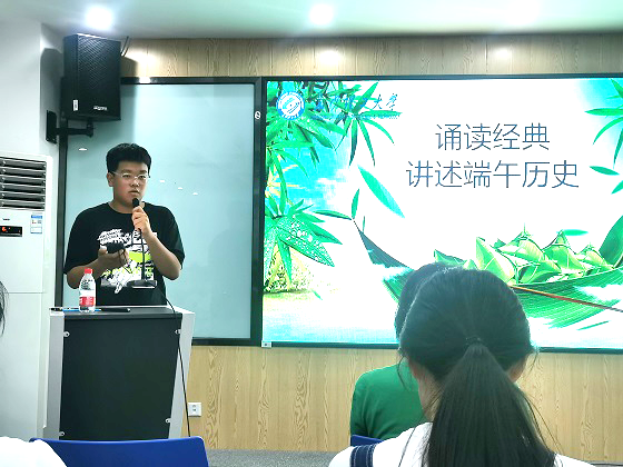 首先,机电教改2001班李家鑫、赵胜祥分别介绍了传统节日端午节的风俗习惯与历史渊源。两位同学从历史人物屈原的故事谈起,分享从古至今中国南北习俗差异,还给大家朗诵了“五月榴花妖艳烘,绿杨带雨垂垂重,五色新丝缠角粽。”的诗歌,号召同学们加强对传统文化的学习。每位同学都领到了端午节的粽子,蜜枣沁心,层层碧叶下,更是美好祝愿与期许。