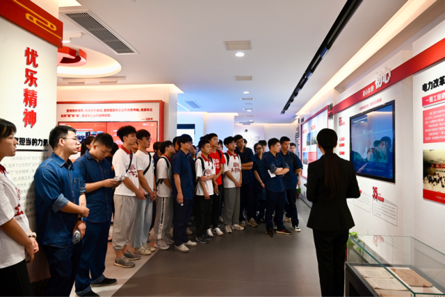 会议结束后全体成员一同参观华能岳阳电厂的企业文化展厅。该展厅通过VR沙盘详细介绍了华能岳阳电厂的艰难奋斗历程及当前所获成就,实践团成员从其初建、改革、完善的全过程中充分感受华能岳阳电厂极具特色的企业文化。