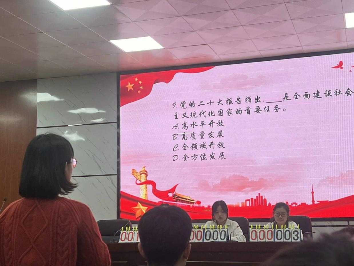 本次抢答赛的主题是“青春践行二十大”,主要围绕党史、中华传统文化知识开展,分为院级初赛、校级复赛及决赛。国际工学院通过线下答题的形式,根据分数排名,选出严慧萍、王昭力、米雨欣、孙振腾四名选手代表学院参加复赛。备赛期间,参赛选手及时温习巩固知识,相互提问,掌握题目。在复赛中,他们思维敏捷,对于历史常识及党史类题目反应迅速,以小组赛积分第一的成绩脱颖而出,成为入围决赛的六支队伍之一。决赛中,国际学子稳定发挥,对答如流,率先抢到题目进入争先组,顺利获得积分。