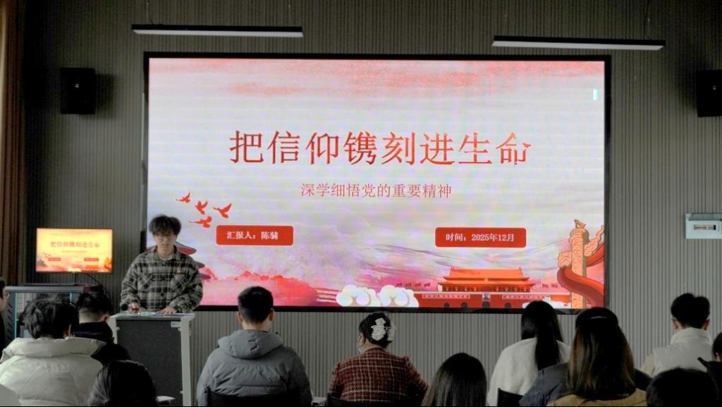 活动伊始,全体与会党员集中观看了微党课视频《把信仰镌刻进生命》。该片通过生动案例和深刻讲述,展现了共产党人坚定的理想信念与崇高的精神追求,为全体党员上了一堂触及灵魂的信仰教育课。随后由学生党员代表陈骕,赵芸东讲授微党课。他们围绕党的二十届四中全会精神及重要文章等分别作了系统深入的分享报告,深度阐释了如何将党的创新理论融入学术科研与日常实践,展现了学生党员扎实的理论功底和积极的学习态度。活动最后,一支部书记易芙蓉、二支部副书记易哲宇分别作总结讲话,围绕全会精神核心要义与实践要求,明确了学习贯彻方向与务实举措。