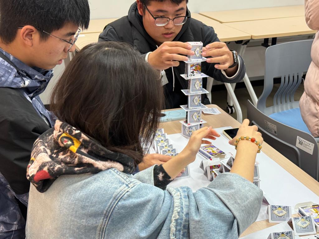 紧接着的“齐心协力搭建扑克牌塔”环节,重点考验团队的耐心与协作精度。各组成员迅速分工、争分夺秒,有的负责规划搭建方案,有的专注整理扑克牌,有的小心翼翼进行堆叠,在8分钟内全力冲刺纸塔搭建任务。该环节不仅要求追求高度突破,更要确保塔身稳固站立10秒以上,现场既紧张有序又趣味十足。过程中,各队不断调整策略、相互补位,在一次次尝试与配合中逐渐拉近了距离。