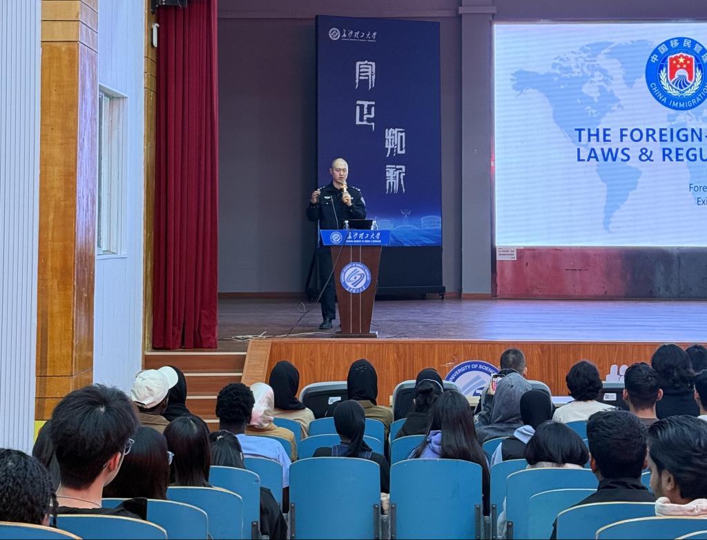 在重点学生座谈会中,外国人管理大队民警刘成亮以“安全与法治”为主题宣讲,解读出入境法律法规重点条款,结合案例提示人身安全、财产保护、社交风险,增强留学生法治意识与自我保护能力。
