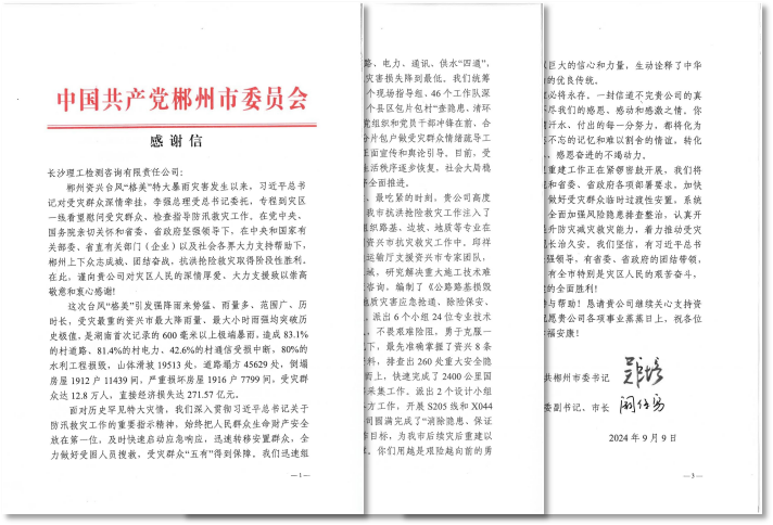近日,公司收到来自中共郴州市委的感谢信。信中,郴州市委感谢了公司在郴州资兴台风“格美”特大暴雨灾害发生以来为抗洪抢险救灾做出的积极贡献。