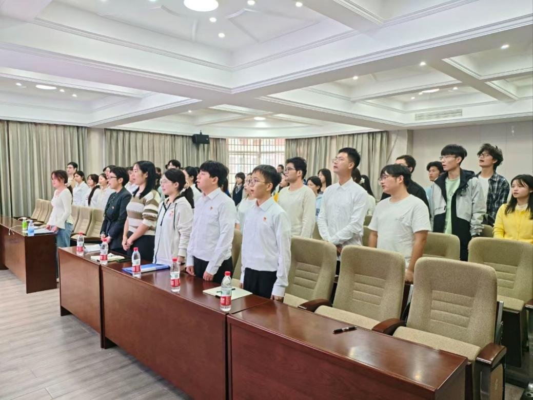 仪式在庄严的《国际歌》中拉开序幕。李娟、肖敏强与各学生党支部代表依次为新入党同志授予党徽,研究生党支部书记朱鸿杰同志领誓,全体党员面向党旗进行庄严宣誓。