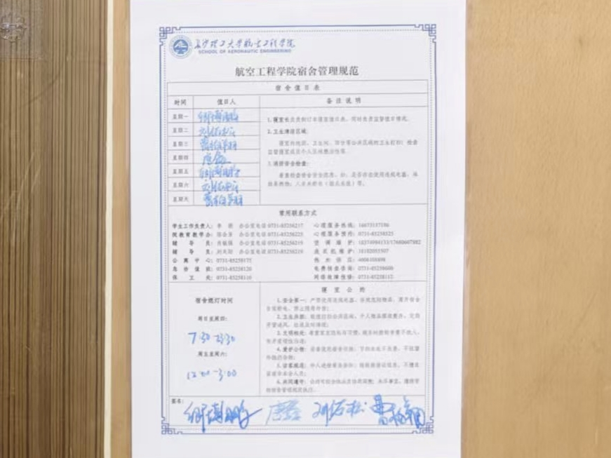 本次排查活动还设置了安全标识、宿舍管理规范表粘贴环节。干事们在宿舍的正门后粘贴了宿舍管理规范表,此表涵盖了宿舍值班表、熄灯时间以及紧急联系方式。这些安全标识既起到了警示作用,又体现了人文关怀,让安全提醒以更亲切的方式融入寝室生活。同学们也普遍反映,这种“检查+标识”的方式既体现了学院对学生的关心,还强化了安全教育。未来会自觉遵守宿舍管理规定,维护寝室安全。