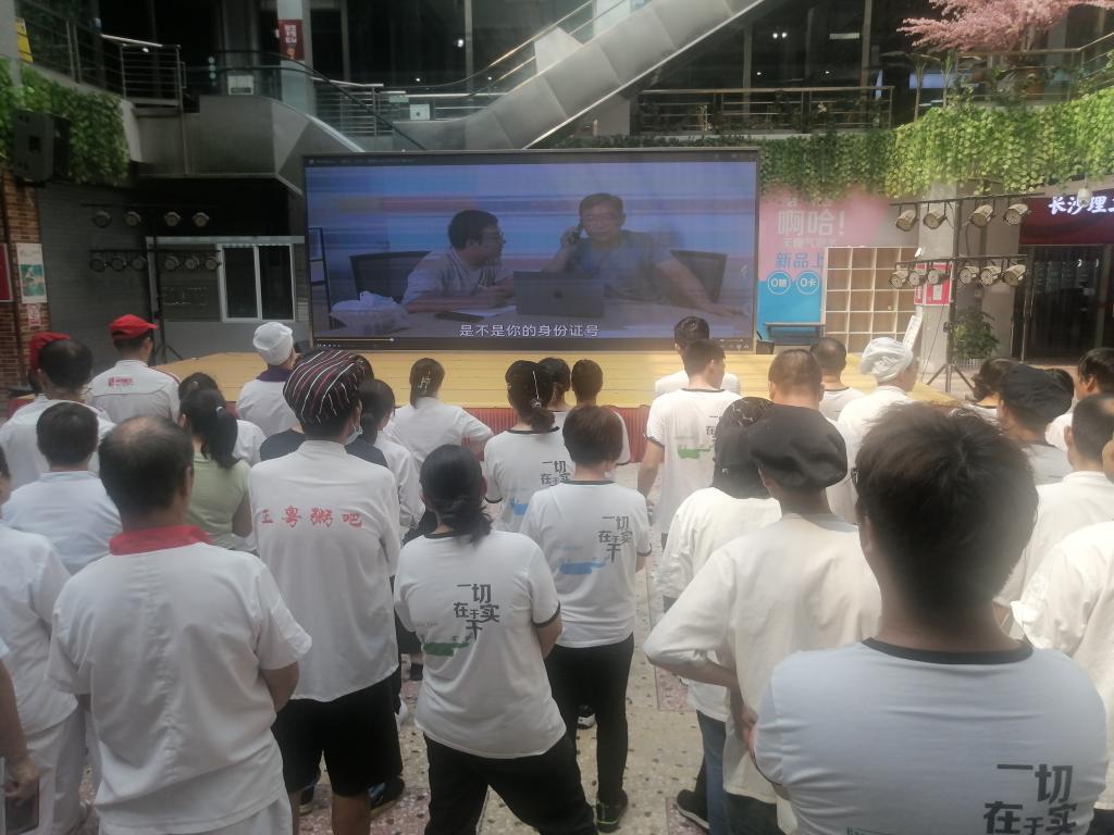 为进一步提高员工的反诈意识和识别能力,9月28日下午1:30,餐饮服务部组织员工在汀香园食堂一楼大厅集中观看反诈系列情景剧《星城无诈》,餐饮服务部干部职工100余人观剧。