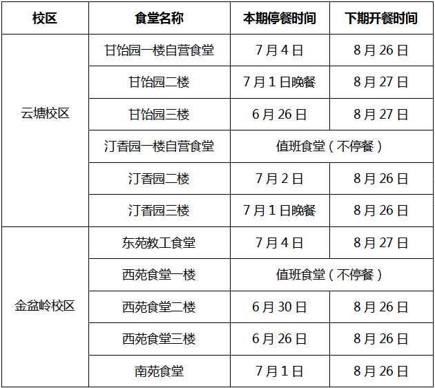 因临近放假,学生陆续离校,就餐人数明显减少。在确保师生就餐前提下,餐饮服务部各食堂将先后停业。具体时间安排如下: