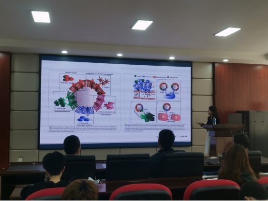 朱静宜副教授结合自身研究经历及国际前沿研究热点,回顾了仿生纳米药物体系的早期发现者在其中的贡献,并提出自己从中得到的灵感,深入浅出地讲述了自己在肿瘤治疗研究过程中遇到的困难以及解决途径。她指出,纳米药物在癌症的精准医疗方面具有广阔的应用前景,但纳米材料易被机体免疫系统识别并清除的特性使得其在癌症治疗方面的应用存在很大的局限性。受自然界生物系统的启发,生物细胞介导的药物递送系统近年来得到了广泛关注。朱静宜副教授的研究工作通过将生物体内源性细胞膜作为功能材料包覆在纳米药物表面,赋予其细胞膜的天然属性,或者将纳米载药粒子直接与活细胞共孵育,制备载药细胞,可以有效地将生物体“自体”的性质与“人工”纳米材料的优势相结合,这不仅大大降低了纳米药物的免疫原性,而且还可使其具备更强的肿瘤靶向能力。