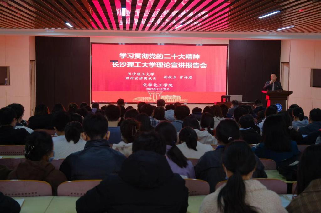 11月29日下午,学习贯彻党的二十大精神william威廉中文官网宣讲团成员、副校长曾祥君在工科三号楼A307会议室为化学化工学院师生宣讲党的二十大精神。学院全体教职工和全体学生党员参加学习,会议由学院党委书记宋刘斌主持。