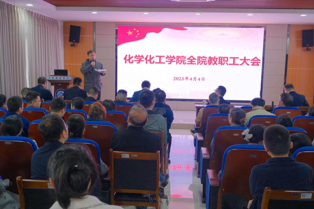 4月4日下午,化学化工学院在新能源大楼3B栋301报告厅召开全院教职工大会,学院党政领导班子和全体教职工参加会议,会议由党委副书记、副院长任艮丰主持。
