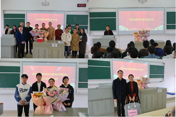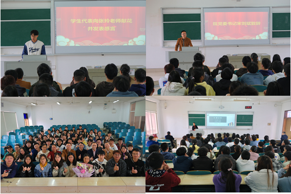 学生代表为张玲老师献花,深情讲述与张玲老师在平时学习生活中的小故事,并代表全体同学衷心祝福老师退休快乐,生活美满,平安健康!张玲老师饱含深情的给同学们上了最后一课,告诫同学们要乐观的去面对生活学习中遇到的困难,做人做事要“外圆内方”、“守规矩”。在感言中张老师回顾了自己从入职到退休的心路历程,感谢学院领导的关怀,同事的帮助和同学们的认可,表达了对学校、学院、学生发展的殷切期盼。最后,张跃飞副院长(主持工作)代表学院为张玲老师赠送荣休纪念品,全体师生合影留念。