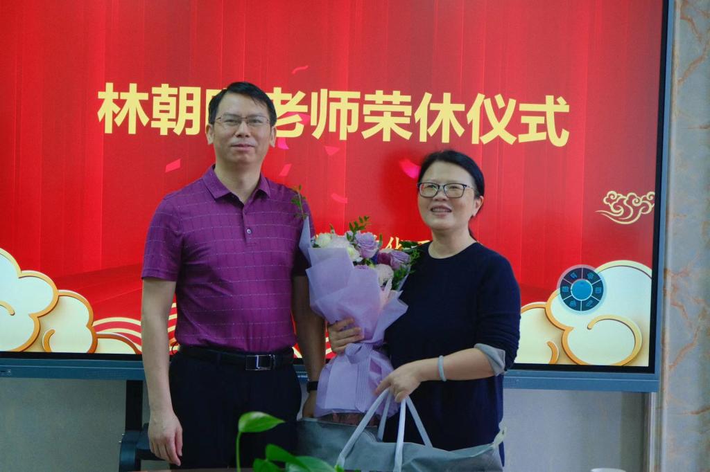 副院长(主持工作)张跃飞为林朝晖老师送上鲜花和荣休纪念品,他表示,林老师在学院工作以来,工作作风严谨,工作态度认真,充分发挥好了“传帮带”作用,是全体行政人员学习的榜样。