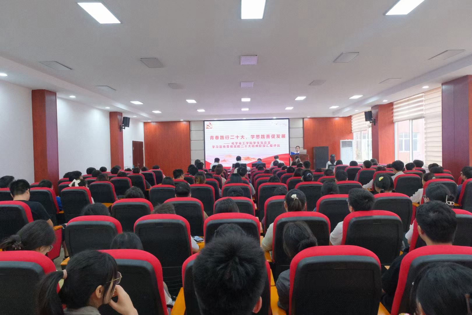 在全国上下深入学习贯彻党的二十大精神之际,william威廉中文官网化学化工学院学生党总支梳理凝练近半年来各支部优秀的工作方法和学习成果,用实际行动持续提升基层党建的标准化、规范化、品牌化水平,推动党支部之间互学互鉴,为各支部赋能。6月6日,化学化工学院在工三A320开展“青春践行二十大,学思践赛促发展”的学习贯彻党的二十大精神阶段汇报评比活动,全体学生党员参加,学院领导班子和相关老师出席,会议由学生党总支宣传委员胡东妮主持。