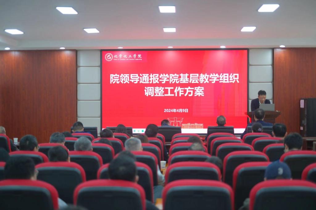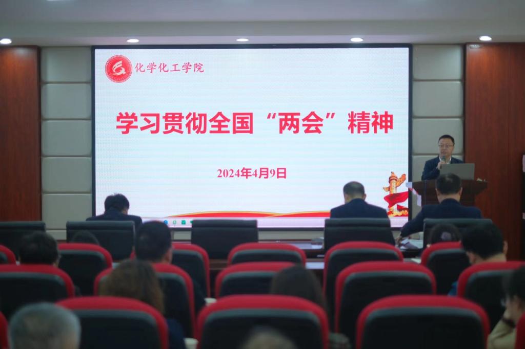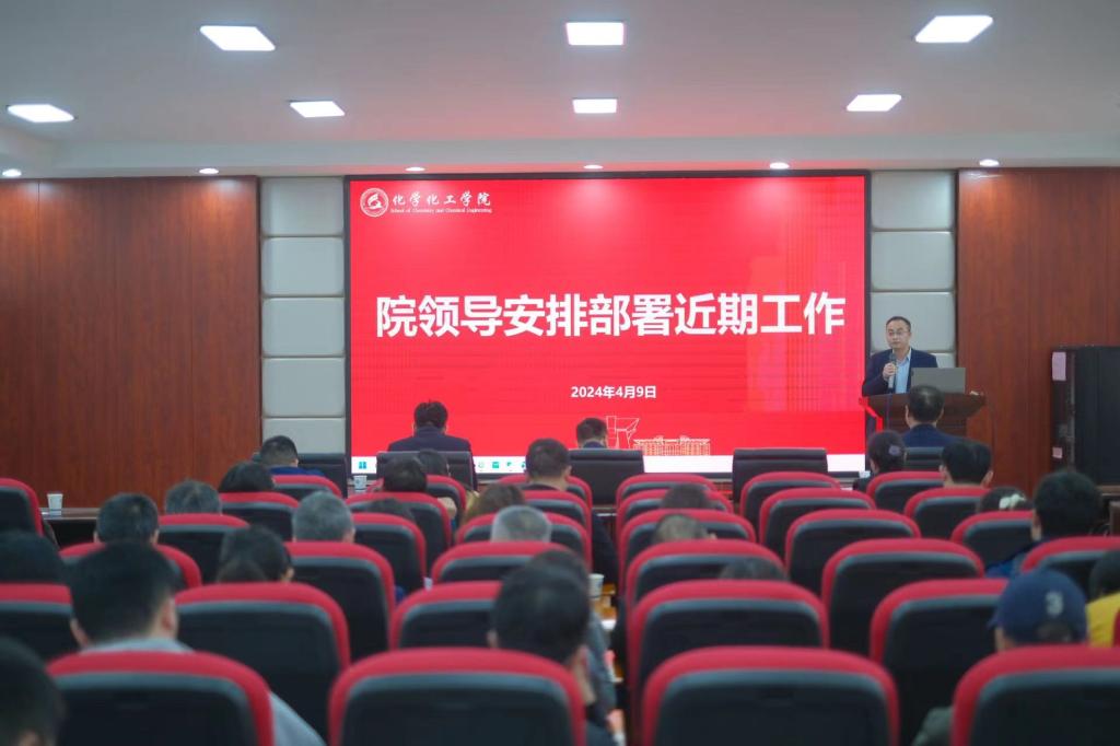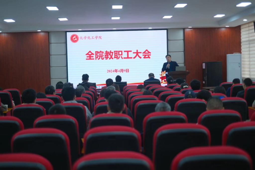 2024年4月9日下午,化学化工学院在工科三号楼A320会议室举行全院教职工大会,学院领导班子及全体教职工参加会议,会议由党委副书记、副院长任艮丰主持。