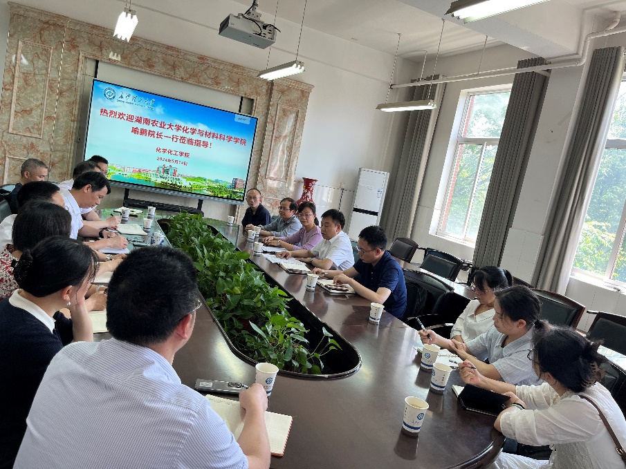 2024年5月14日,湖南农业大学化学与材料科学学院院长喻鹏一行莅临化学化工学院进行交流访问。学院党委书记宋刘斌、院长张跃飞、副院长陈启杰及多位教师代表参加了本次交流活动。