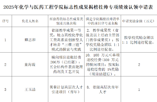 根据学院《关于印发《化学与医药工程学院标志性成果揭榜挂帅清单》的通知》精神,经个人申请、党政联席会评议讨论,共有3项标志性成果符合揭榜挂帅专项绩效认定要求,现面向全院进行公示。公示期内如有异议,请向学院党政办公室实名反映。