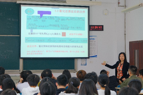 王玉枝教授深入浅出、生动精彩地讲授了《分析化学》课程中氧化还原滴定部分的内容。课程围绕氧化还原反应的原理与条件、氧化还原反应的方向及影响因素、氧化还原反应的次序、氧化还原反应的完全程度四点主要内容展开,通过启发式教学、课堂思考等环节重点讨论了如何用分析化学基础知识开展诸如动脉粥样硬化表观遗传相关活性氧的纳米检测与应用等领域的前沿研究。王教授还结合课程中涉及的能斯特、哈伯等科学家的事迹,润物无声般地为同学们树立了作为科研工作者应有的正确价值观和人生观,并强调面向国家需求、服务人民健康是分析化学创新研究的动力来源。