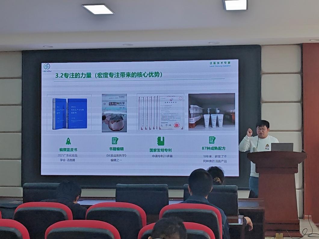 李承勇总经理结合自身的创业经历以及公司对于洁面产品的科研历程,向大家介绍了洁面技术和洗面奶的现状以及与国外先进技术的差距,并向大家描述了未来“智能化洁面”的发展愿景。讲座现场气氛活跃,讲座结束后,同学们热烈鼓掌,踊跃提问,互动良好。通过此次讲座,同学们对精细化工化妆品领域的发展有了新的认识,激发了学习兴趣。