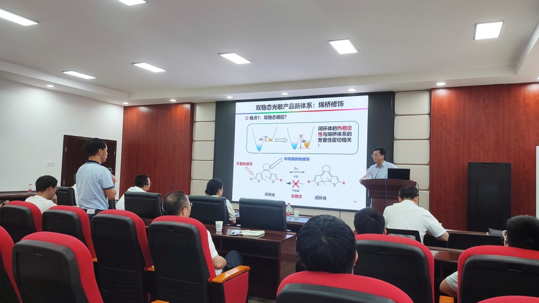 朱为宏教授分别从光敏化学产品的背景、研发目标、设计过程和产业化等方面进行了深入浅出的阐述,详细介绍了有机光敏剂纳米化宏量制备、位阻型烯桥光敏体系、共价重构COF材料等方面的工作。报告结束后,朱为宏教授与师生开展了热烈的讨论,朱教授鞭辟入里地回答了老师们的问题,并针对青年教师基金项目的撰写等方面提出了宝贵的建议,让在座师生受益良多。