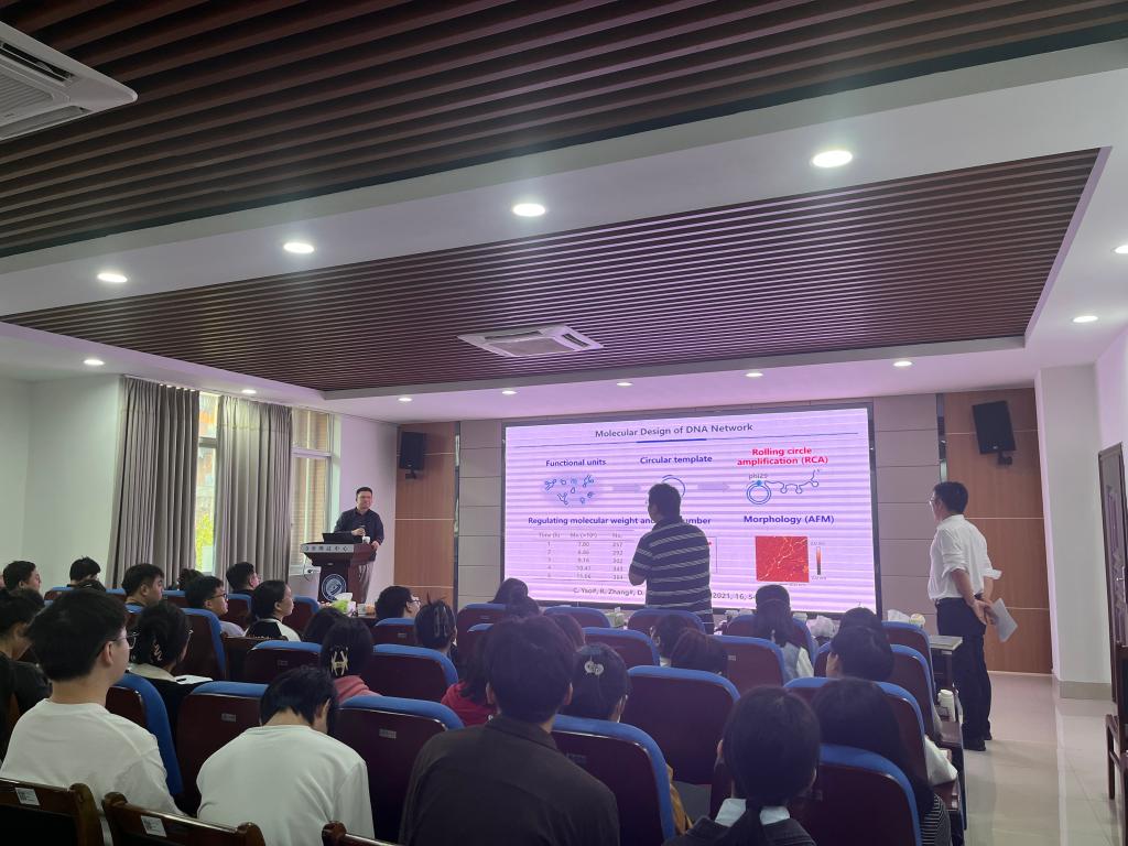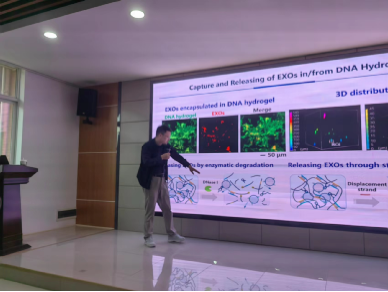 仰大勇教授从脱氧核糖核酸(DNA)入手,深入浅出的介绍了课题组利用DNA分子组装功能材料用于重大疾病诊断和治疗的相关工作。他指出,DNA 是天然的生物高分子,是一种符合“绿色精准”发展理念的新型材料。课题组利用RCA技术,建立了DNA分子网络组装策略,合成了超柔性DNA水凝胶,并利用DNA材料实现了细胞、细菌外膜囊泡的高效分离和无损递送,以及核酸药物的可控精准递送和肿瘤治疗;并建立了基于树枝状DNA构筑基元的DNA功能材料构建策略,实现了DNA功能材料的精准模块化合成。