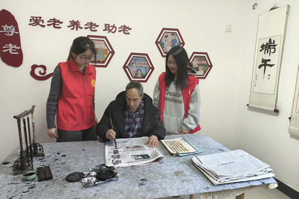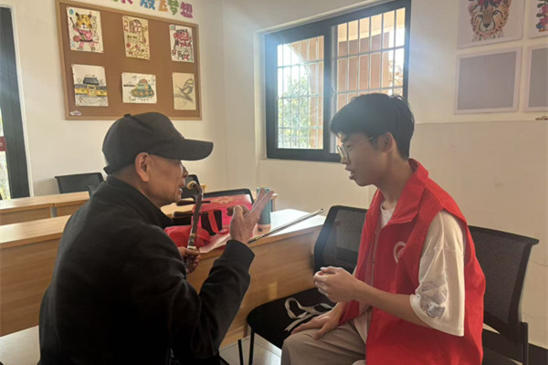 在整洁明亮的活动室里,志愿者们围坐在老人身边,静静聆听他们讲述过往的故事。一位老人兴致勃勃地铺开宣纸,挥毫泼墨,笔走龙蛇间尽显书法韵味。志愿者们认真观摩,不时请教用笔技巧;另一侧,二胡声悠扬响起,志愿者们静静聆听,为老人的精彩演奏鼓掌喝彩。书法与二胡的交织中,代际间的温情在笔墨书香里静静流淌。