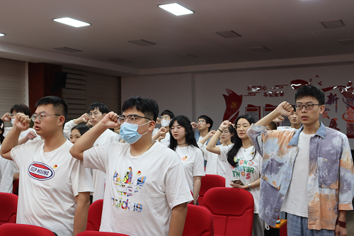 授课结束之后,在场的学生干部在团旗面前重温入团誓词,一只只握紧的拳头,一声声铿锵有力的誓言,展示着青年干部们牢记初心使命,将青春奉献给祖国和人民的决心。最后,全体人员一同观看了由中共湖南省委宣传部指导,省教育工委和省教育厅主办的大型原创实景式移动思政节目《为时代育新人》第一集《青春之歌》。在党委和上级团组织的领导下,化学化工学院分团委全体成员必将不负韶华,勇创佳绩,真正做到让党放心、强国有我!(图文/张航 审/陶双)