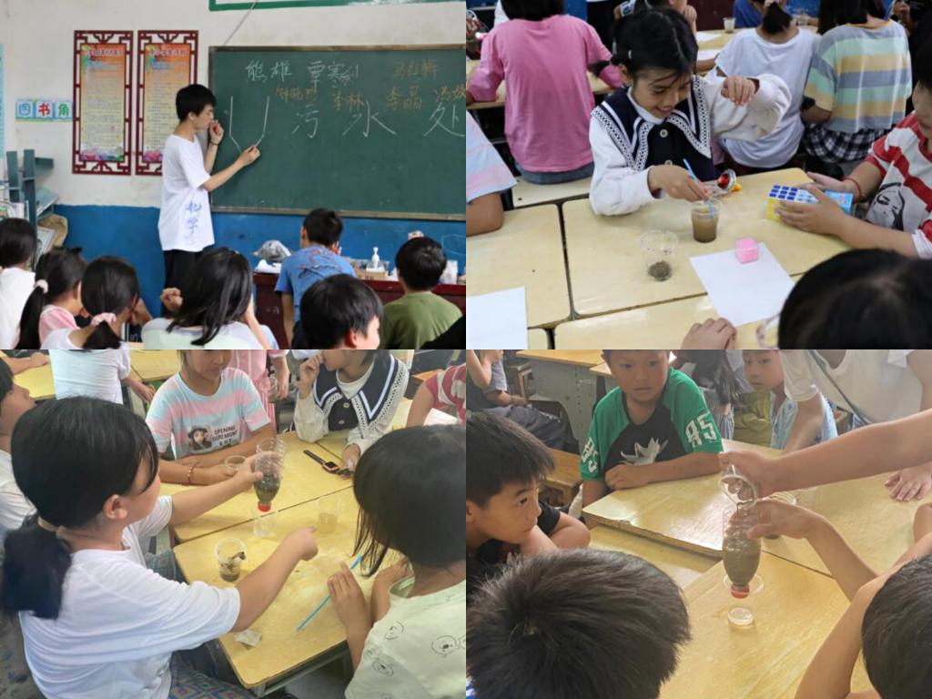 活动伊始,团队负责人熊雄在孩子们热烈的鼓掌声中对实践团队的基本信息进行了介绍。随后根据课程安排由志愿者潘沛峰为孩子们讲解污水处理实验和过滤实验的基本原理,并演示了实验的具体操作。演示过程中,潘沛峰就本次实验的易错点和难点对孩子们进行提问,增强课堂互动性的同时,也加深了孩子们对实验的理解。演示结束后,团队其他成员给每组分发实验材料,让孩子们通过自己动手实践操作,切身体会化学实验的乐趣。