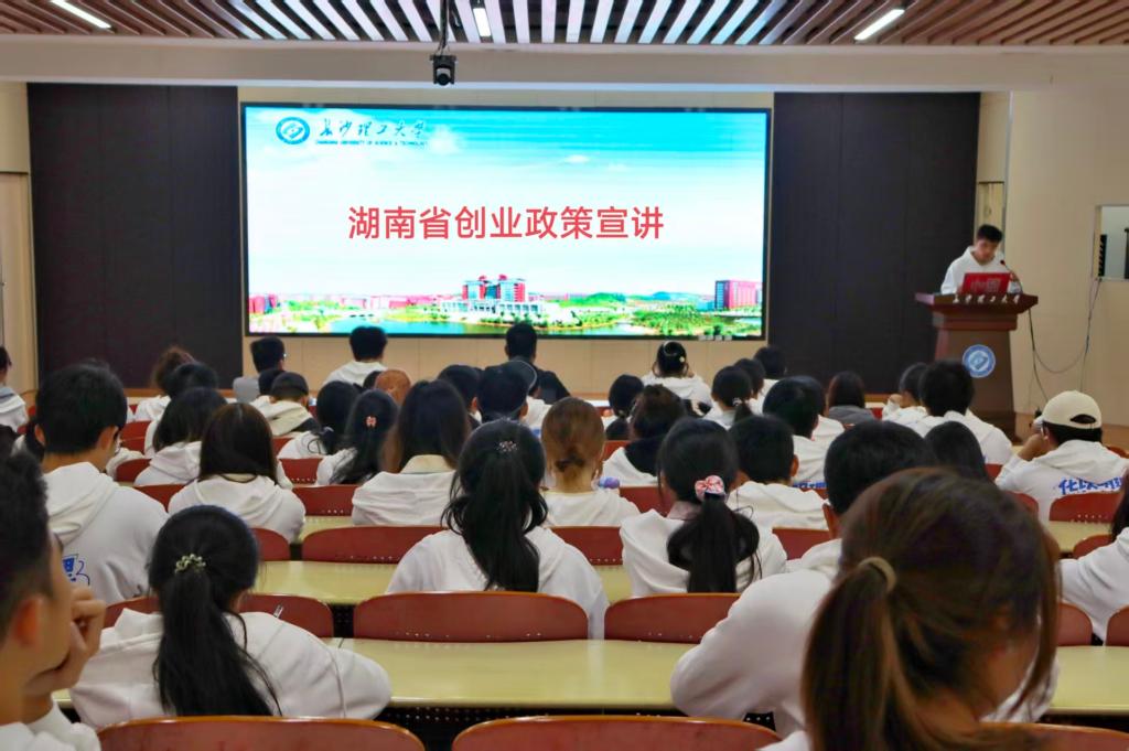 宣讲会上,张航系统梳理了湖南省近年来推出的一系列支持大学生创新创业的政策措施。他结合具体文件与案例,重点解读了创业担保贷款、税收减免、创业补贴、场地支持、赛事奖励等关键政策,详细说明了各项政策的申请条件、办理流程和注意事项。张航特别强调了政策与学科专业的结合点。他指出,化学、制药、材料等相关领域的学生创业项目,在湖南省“三高四新”战略引领下,尤其在新材料、生物医药等战略性新兴产业方向,能够获得更大力度的扶持。他鼓励同学们主动关注“湘就业”“湖南人社”等官方平台,及时获取政策动态。
