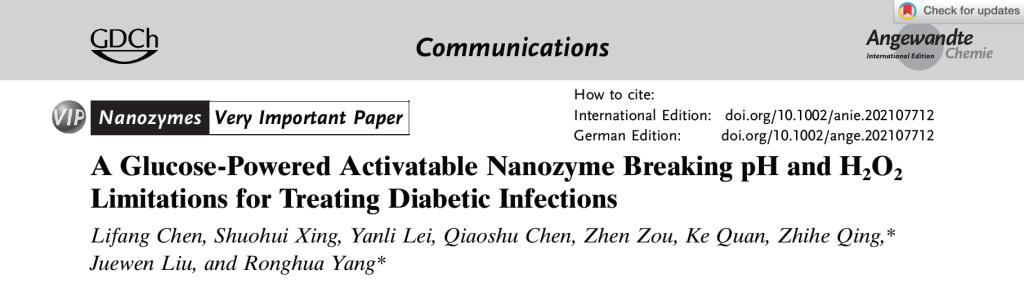 首先,基于DNA探针在铂纳米颗粒表面的高稳定性修饰和高保真信号释放的前期研究基础(Zhihe Qing, et al. Angew. Chem. Int. Ed. 2020, 59, 14044-14048; Zhihe Qing, et al. CCS Chem. 2020, 2, 1217–1230),卿志和博士课题组发展了一种细菌感染激活的纳米酶,在生理条件下同时打破局部pH和过氧化氢的限制,提高慢性伤口部位的抗菌效果。选取糖尿病伤口感染为研究模型,以DNA分子(细菌特异性核酸适体)功能化的铂纳米酶、葡萄糖氧化酶和透明质酸为组装单元,构建透明质酸酶(HAase)激活的纳米酶胶囊(APGH)。APGH在受感染的伤口中被细菌分泌的透明质酸酶激活,之后纳米酶通过表面修饰的核酸适体与细菌结合,葡萄糖氧化酶催化糖尿病伤口中高浓度的葡萄糖氧化,降低pH,补充过氧化氢,铂纳米酶在细菌表面原位生成·OH,提高了化动力学杀菌效果。APGH的活性转化与抗菌作用在体外实验和糖尿病伤口抗菌实验中得以验证。这种通过调控生理微环境以增强纳米酶活性的策略具有通用性,对促进纳米酶的生物学应用具有重要意义(Scheme 1)。该工作以“A Glucose-Powered Activatable Nanozyme Breaking pH and H2O2 Limitations for Treating Diabetic Infections”为题,于2021年8月10日发表在国际化学领域顶刊Angewandte Chemie,并入选VIP论文(Very Important Paper)和封面成果(Frontispiece),并被期刊官媒作新闻(News)报道。文章共同第一作者是william威廉中文官网硕士生陈丽芳、硕士生邢硕晖和雷艳丽博士,通讯作者是卿志和副教授和杨荣华教授。文章链接:https://onlinelibrary.wiley.com/doi/10.1002/anie.202107712。