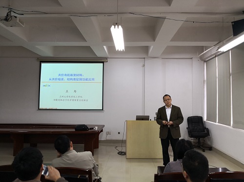 共价有机框架材料(Covalent Organic Frameworks,COFs)是有机单体通过共价键的连接、在二维或三维方向上形成的一类新型的有机多孔高分子材料,如何获得大尺寸和高质量的单晶是共价有机框架材料领域中的一个重大挑战。报告会上,王教授就COFs材料的基础研究以及近期他们课题组所取得的研究成果进行了分享。王教授从如何采用共价组装实现晶型结构的精准构筑,如何实现结构和功能的“一箭双雕”组装,如何精细表征晶型有序的多孔结构,以及如何实现基于其结构特征的功能化应用等方面进行了详细深入的讲解。在自由交流环节,学院教师和同学积极提问,就如何调控COFs材料孔径、如何实现COFs材料的生物应用、COFs材料的单原子金属催化剂制备以及膜材料的潜在应用等问题与王教授展开了热烈讨论,现场气氛非常活跃。王为教授的精彩演讲赢得了在场师生阵阵热烈的掌声。