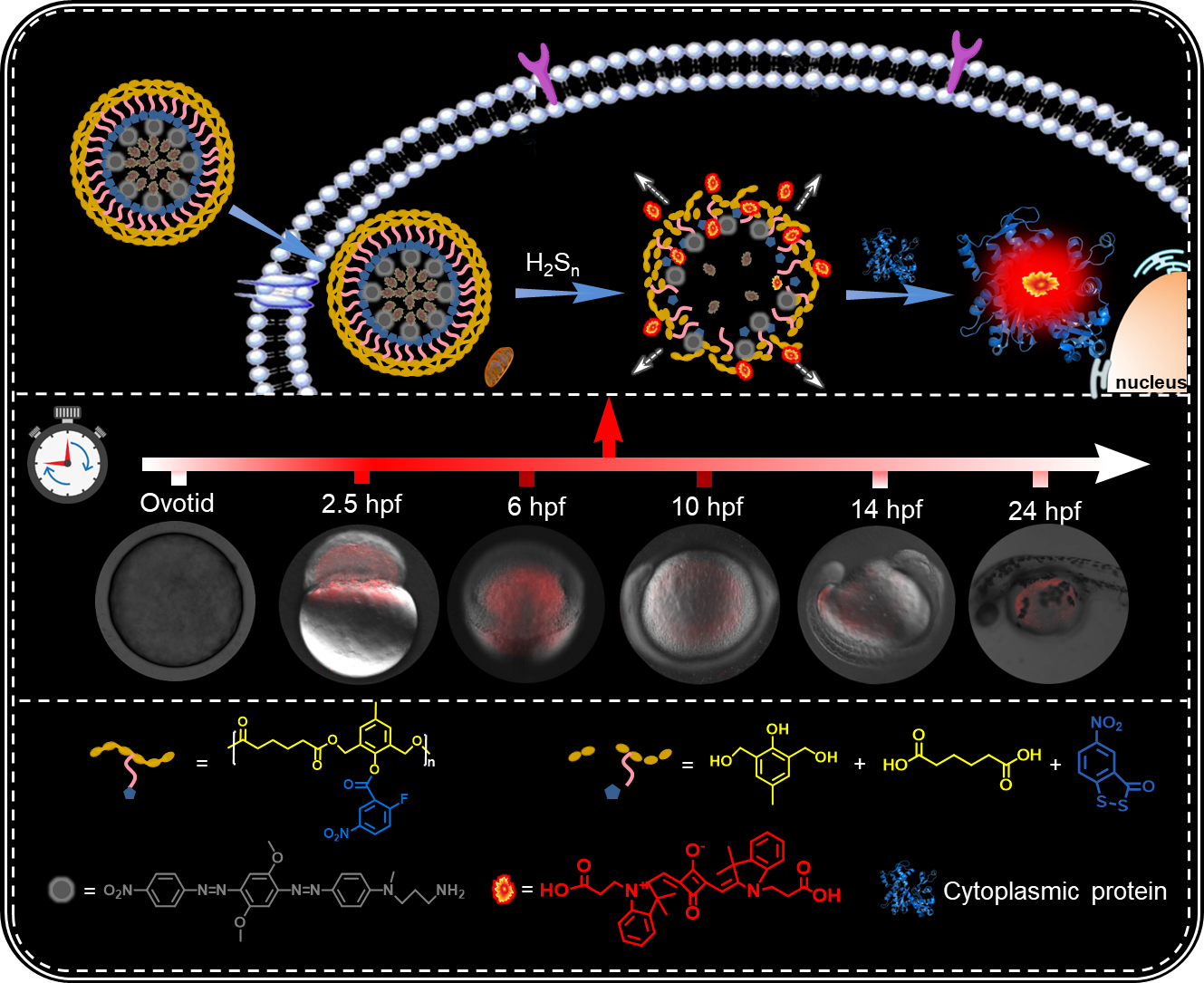 作者基于在荧光探针及激活式载体方面的研究基础,首先设计和合成了H2Sn刺激响应的聚合物胶束载体,通过信号转换设计和信号单元标记,构建了H2Sn刺激响应的荧光纳米信标。纳米信标进入胚胎细胞后,其被内源性H2Sn激活后,释放荧光染料,染料与猝灭剂脱离后荧光信号恢复,实现信号放大,且染料可与胞浆蛋白结合,进一步实现荧光信号大幅度增强,从而达到二次信号放大。聚合物纳米信标通过两次信号放大模式展现出极高的灵敏度,从而实现对胚胎发育过程中的H2Sn进行荧光成像。