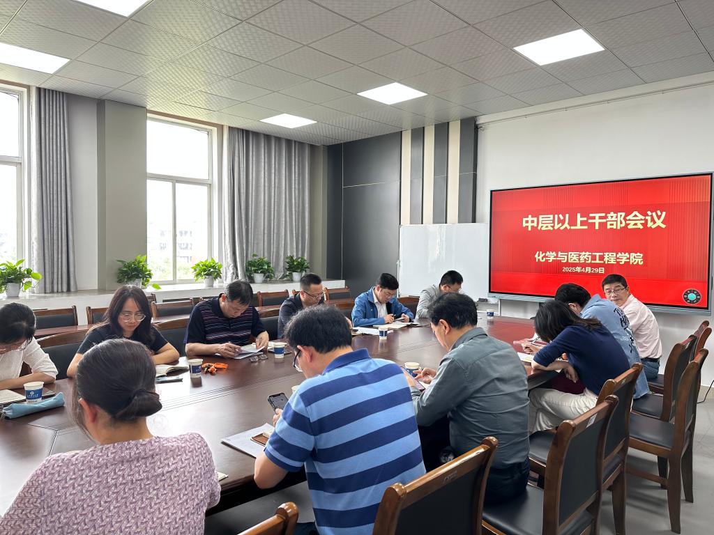 2025年4月29日下午,化学与医药工程学院在工科三号楼B446会议室召开中层以上干部会议,学院领导班子及中层以上干部参加会议,会议由院长张跃飞主持。
