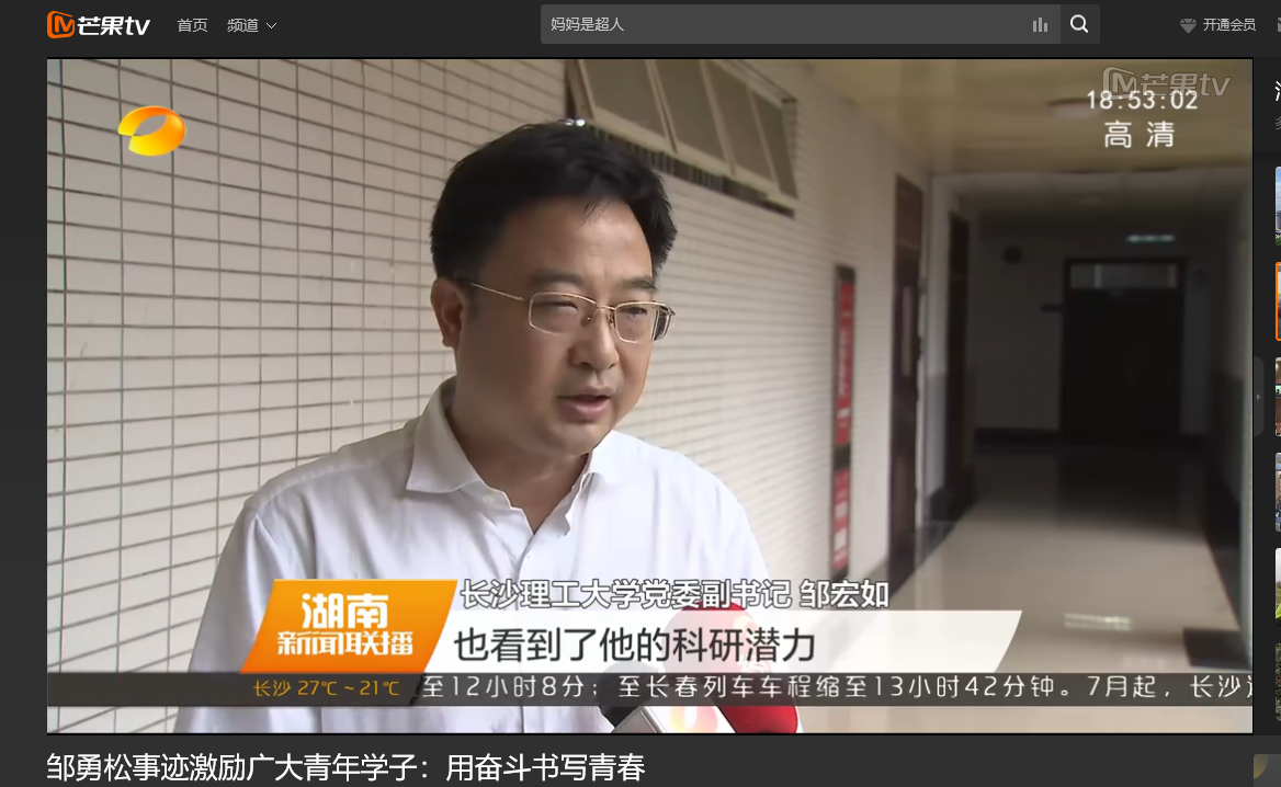 湖南卫视 6月11日新闻联播,以《邹勇松事迹激励广大青年学子:用奋斗书写青春》对william计算机与通信工程学院15级研究生邹勇松进行了报道。