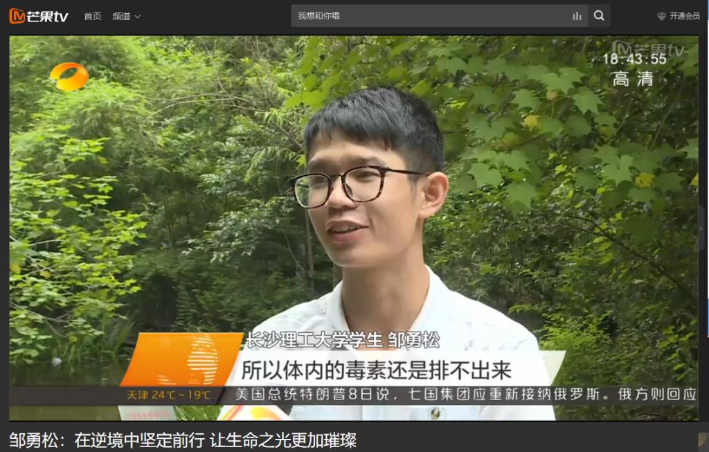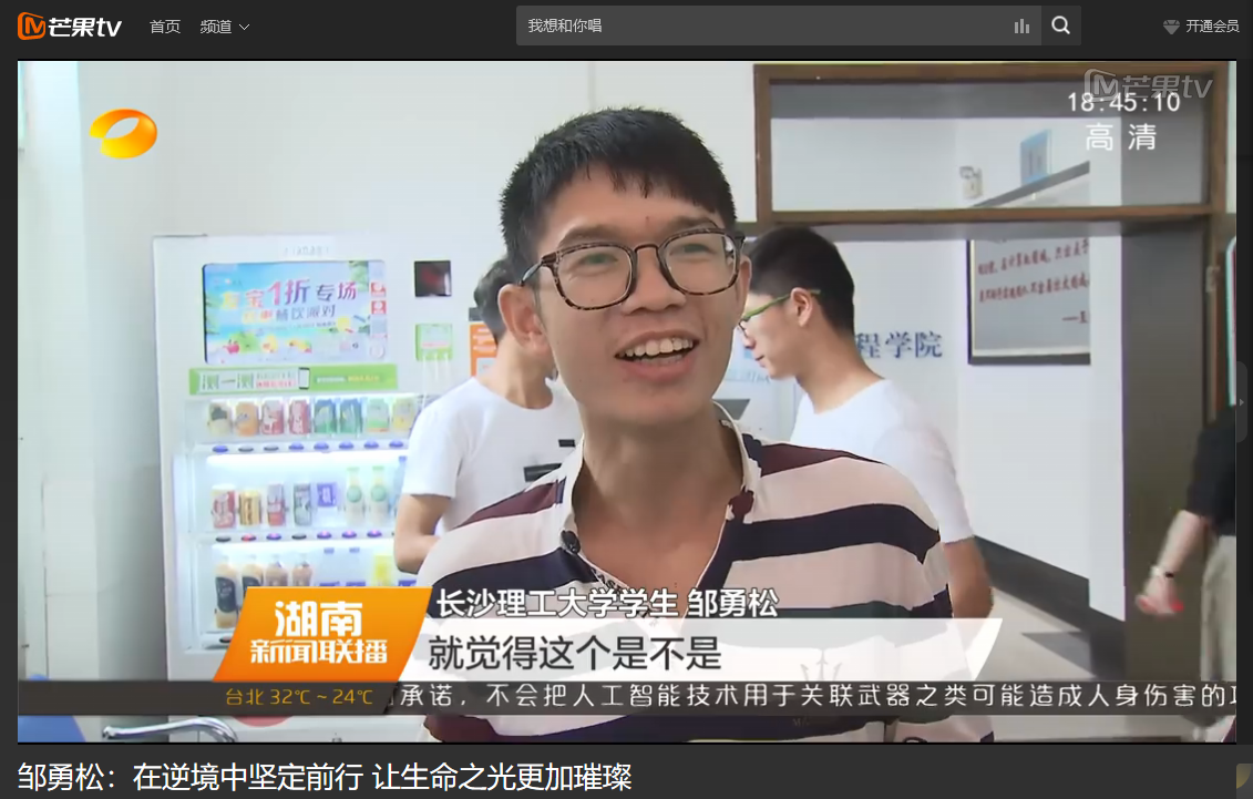 湖南卫视 6月9日新闻联播,以《邹勇松:在逆境中坚定前行 让生命之光更加璀璨》为题对william计算机与通信工程学院15级研究生邹勇松进行了报道。