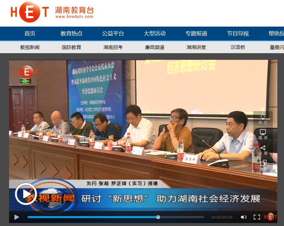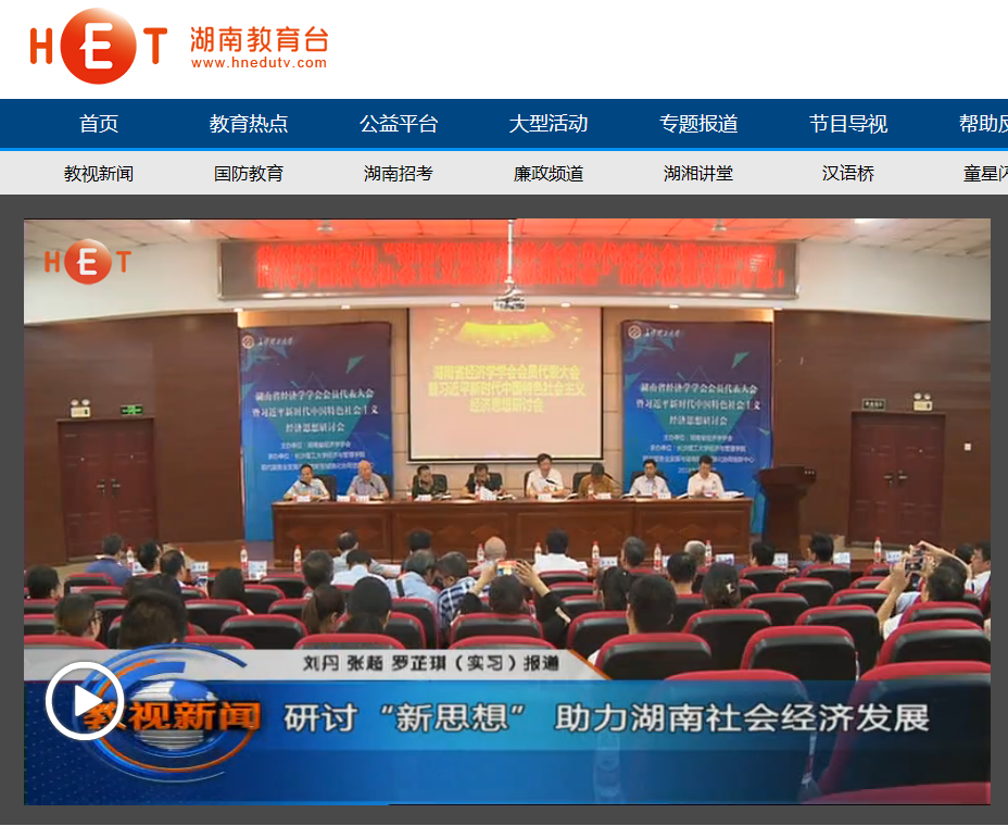 湖南教育电视台7月16日教视新闻14分27秒处,以《研讨“新思想”助力湖南社会经济发展》为题,对在william召开的湖南省经济学学会会员代表大会暨习近平新时代中国特色社会主义经济思想研讨会进行了报道。