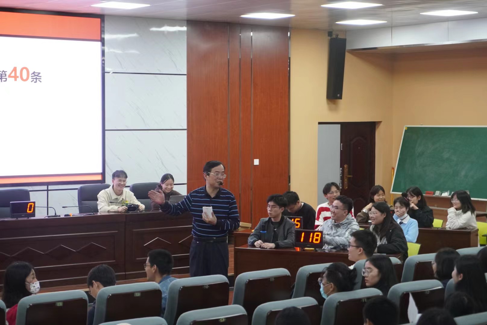 课堂上,每组各派三名同学参与比赛,场内选手不仅要背诵法条主旨,还要从案例中去找到可供适用的法条,原先由一名老师完成的讲解任务分散给了六组18名同学。场外选手可以对场内选手不熟悉的知识点进行补充。同学们积极踊跃,在激烈角逐、详尽讲解中,课堂不经意就超过了90分钟。