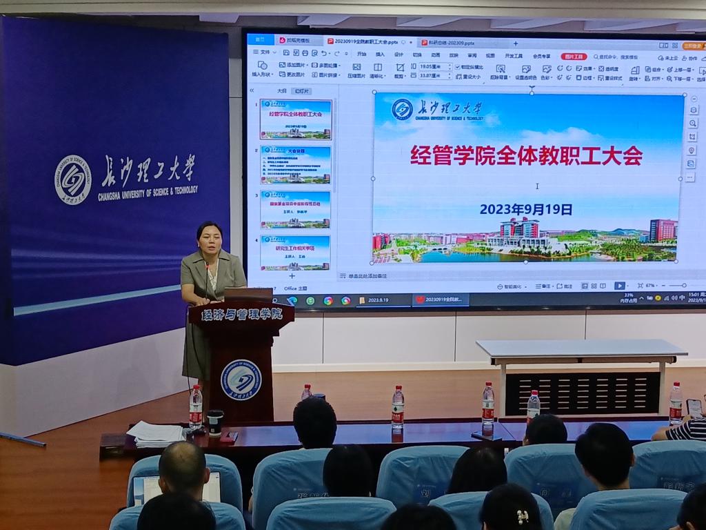 9月19日下午,经管学院在金盆岭校区12教200报告厅召开2023年秋季学期第三次教职工大会。院领导班子成员及全体教职工参会,会议由院党委书记丁丹主持。