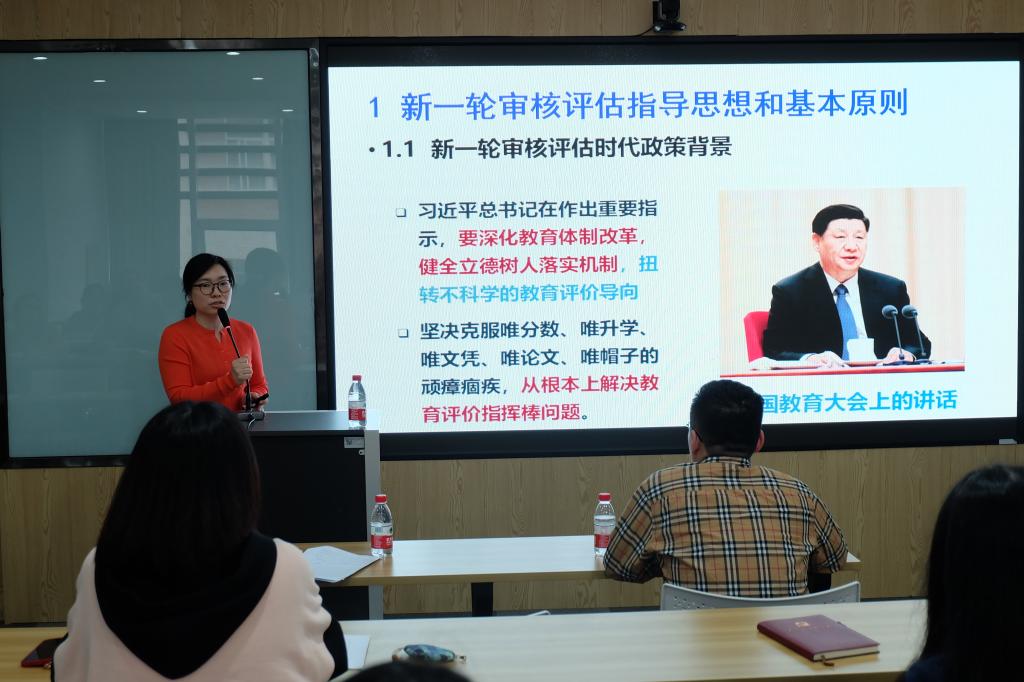 会上,吴悠首先传达学校本科教育教学审核评估教学院工作布置会的会议精神,明确在本轮审核评估中william申请参加第二类第一种类型评估,重点以学术型人才培养为主要方向的普通本科高校。接着,院教务办公室主任兼院评估工作小组联络员余志介绍新一轮本科教育教学审核评估时代政策背景、指导思想、基本原则、突出特点和审核评估流程,并对本轮审核评估的指标体系构成及内涵进行解读。随后吴悠从学校审核评估工作方案到学院审核评估工作方案的指标任务对接进行详细阐述,明确学院审核评估指标及审核评估的主要工作内容及任务指标,并对涉及的各部门人员安排、工作任务、进度安排等方面进行布置。