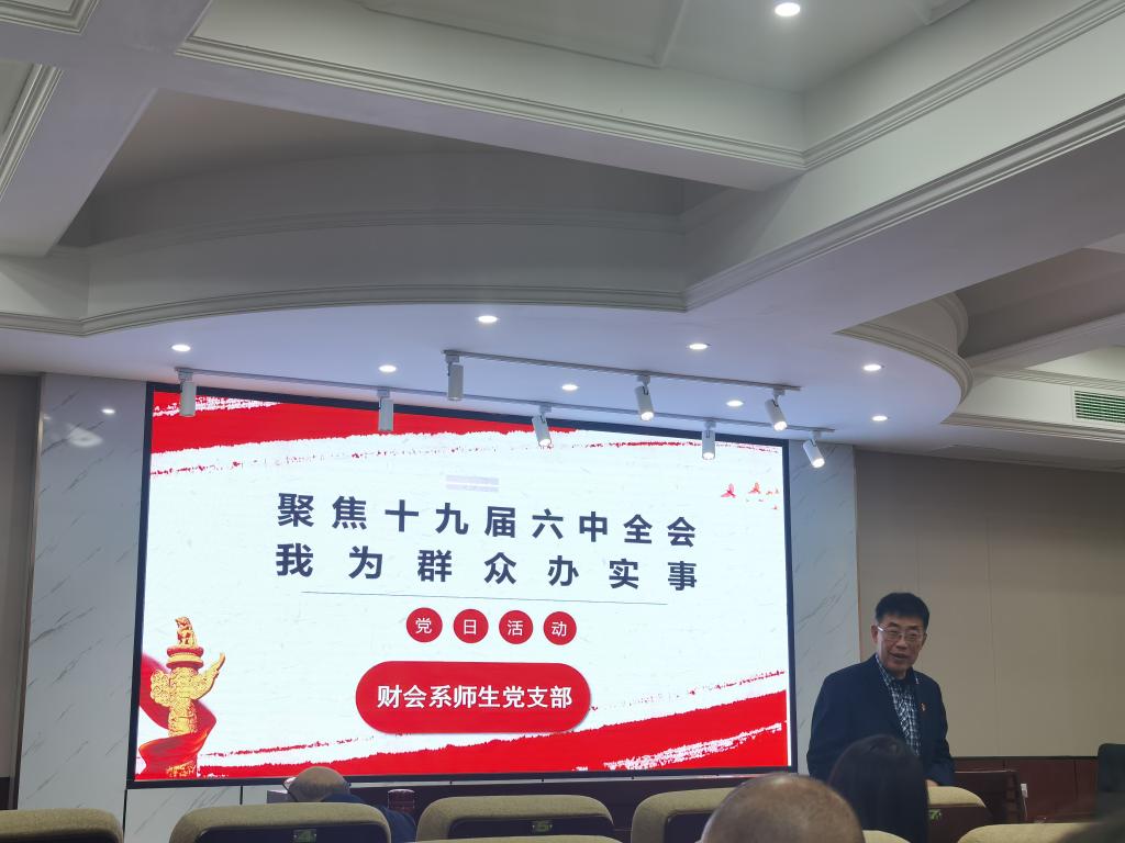 首先,刘天雄带领全体党员回顾党的十九届六中全会相关要点并从六个方面为全体师生党员全面且细致地解读党的十九届六中全会公报内容。接着,周路路号召广大学生党员与老师们分享学习心得,将全会精神贯彻落实到实际行动中去,在支部全体党员中掀起学习全会精神的新风尚。会计第一学生党支部胡心仪同学分享到保研后面对学弟学妹们关于保研学习生活的相关问题她都会认真解答无私分享自己的保研学习经验努力做到为群众办实事沈子豪同学则结合近日校内电动车管理措施分享他作为一个电动车摆放引导员工作过程中是如何落实办实事精神的