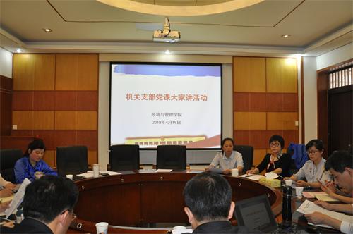 4月19日下午,机关党支部在文科楼D506进行本学期第一次“党课大家讲”,本次党课主讲人为院党委副书记涂道勇和学工办庄奕,院党委书记王宏及其他支部成员参加党课学习。