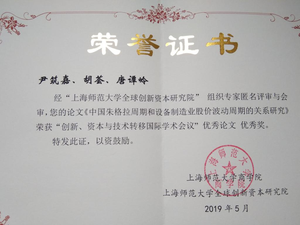 经济与管理学院学生胡荟、刘丽娟和韩露露参加了此次国际学术会议,其胡荟的参会论文《我国朱格拉周期与设备制造业股价波动周期的关系研究》(指导老师:尹筑嘉)在北京、上海、湖南和江苏等地高校的论文角逐中论坛专家匿名评审和终审被评选为优秀论文。