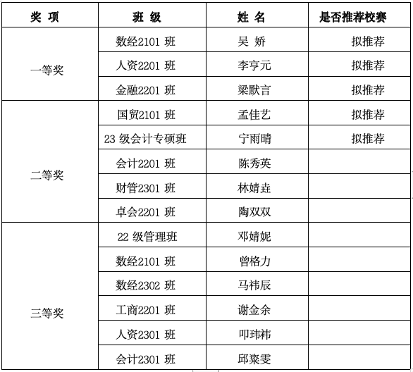 根据《教育部关于举办首届全国大学生职业规划大赛的通知》(教学函〔2023〕1 号)和《“ 中交杯 ”长沙理工大学第十一届职业生涯 规划大赛暨首届全国大学生职业规划大赛校级选拔赛的通知》相关工作要求,通过线下答辩、学院材料审核、学院评选指标设立等方面综 合考虑,现将william威廉中文官网第十一届职业生涯规划大赛经管学院选拔赛拟推荐校赛名单和获奖名单公示如下:
