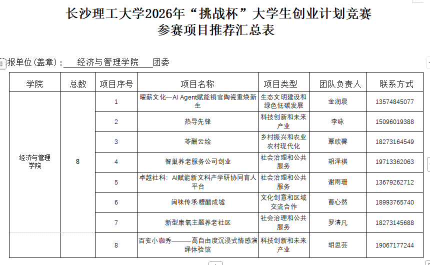 经过各项目自主申报,学院审核,拟推荐以下8个项目,参加william威廉中文官网2026“挑战杯”大学生创业计划竞赛,具体名单如下,公示期为:2026年3月19日-3月23日,公示期间如有问题,请实名反馈至学院团委何老师:0731-85222309.