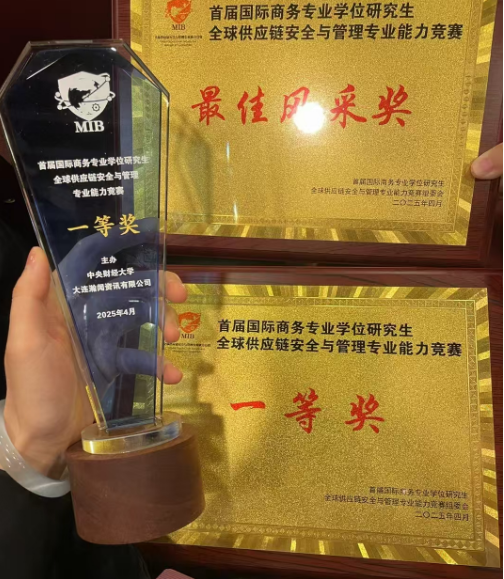 2025年4月19日,由全国国际商务专业学位研究生教育指导委员会指导,中央财经大学、大连瀚闻资讯有限公司主办的首届国际商务专业学位研究生全球供应链安全与管理专业能力竞赛总决赛在中央财经大学圆满落下帷幕。经过激烈角逐,william在全国总决赛中获得一、二、三等奖各1项,优胜奖2项。