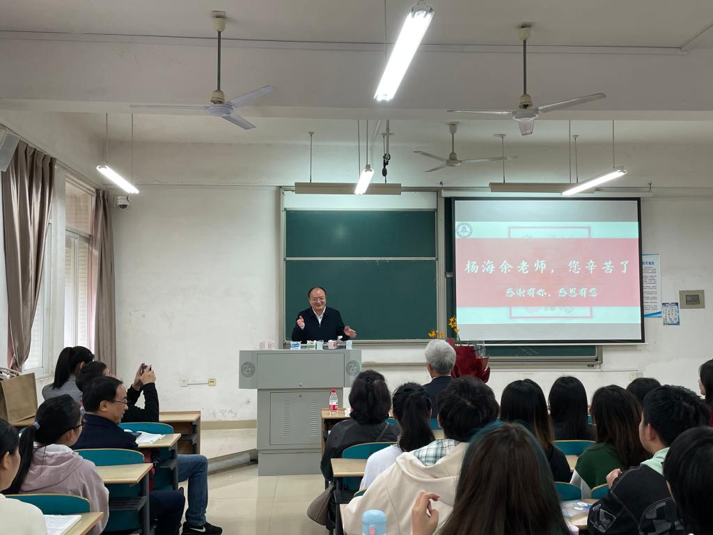 副院长彭新宇代表学院对杨老师致谢。“一支粉笔染双鬓,三尺讲台度春秋”,他衷心感谢了杨海余老师从教近四十年来坚守立德树人初心,辛勤耕耘,默默付出,感谢了杨老师为学院学科发展、人才培养、社会服务、文化传承等方面作出了重要的贡献。希望杨老师继续关心学院的发展,支持学院的工作。祝福杨老师身体健康、幸福美满。