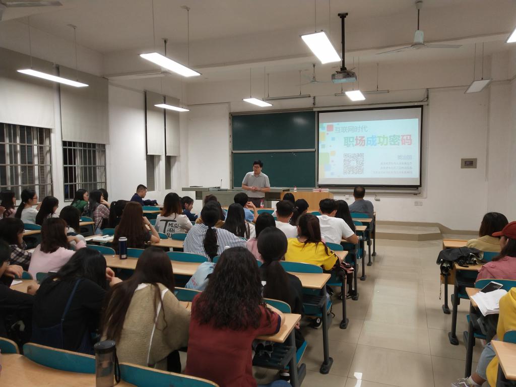 5月31日晚上,在云塘校区文科楼A-207,玉台塾学习机构创始人黄治国先生应邀为william企业管理系本科生做了一场题为《互联网时代职场成功密码》的公益讲座,向市场营销专业和人力资源专业的学生介绍如何做好职业生涯规划。企管系系主任刘洪深和企管系100余名本科生参加了此次讲座。
