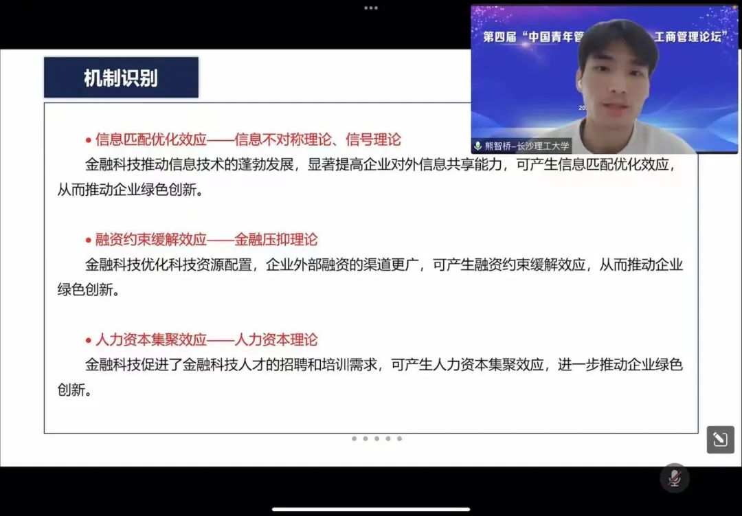 11月26日由首都经济贸易大学主办,首都经济贸易大学工商管理学院、会计学院承办的第四届“中国青年管理学者论坛•工商管理论坛”在北京线上举行。我院22级博士研究生熊智桥受邀参加“可持续创业与中国特色创新”分论坛,并汇报了其撰写的学术论文《金融科技与企业绿色创新:机制识别、情境探析与经济效应》。