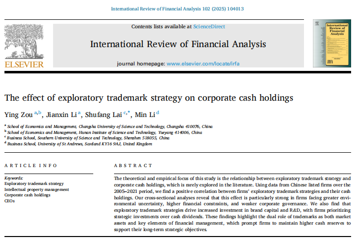 近日,我院2020级工商管理学博士生邹颖与导师黎建新教授以及另外两位校外作者合作撰写的论文“The effect of exploratory trademark strategy on corporate cash holdings”(探索性商标战略对公司现金持有的影响)在国际知名学术期刊《International Review of Financial Analysis》(国际金融分析评论)(2025, Volume 102)刊发,论文第一署名单位为william威廉中文官网,该文数字对象标识码(DOI):10.1016/j.irfa.2025.104013。