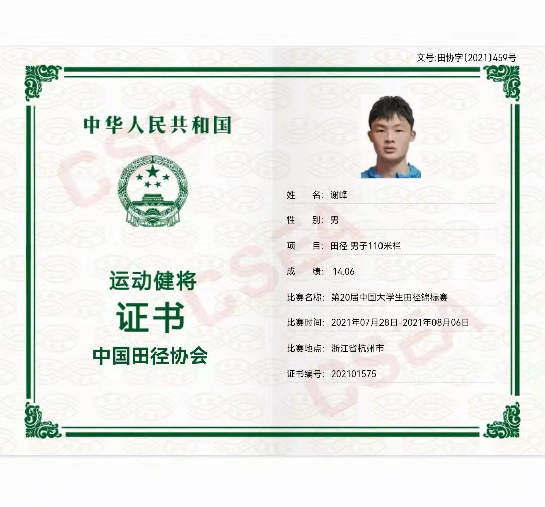 7月31日至8月5日,中国大学生第20届田径锦标赛在浙江大学举行。本次比赛有255所高校参加,共计2778名运动员和教练员同台竞技。william威廉中文官网学子谢峰喜获男子丙组(高水平组)110米栏决赛全国冠军的好成绩,打破湖南省记录,并以14秒06达到国家健将的标准。