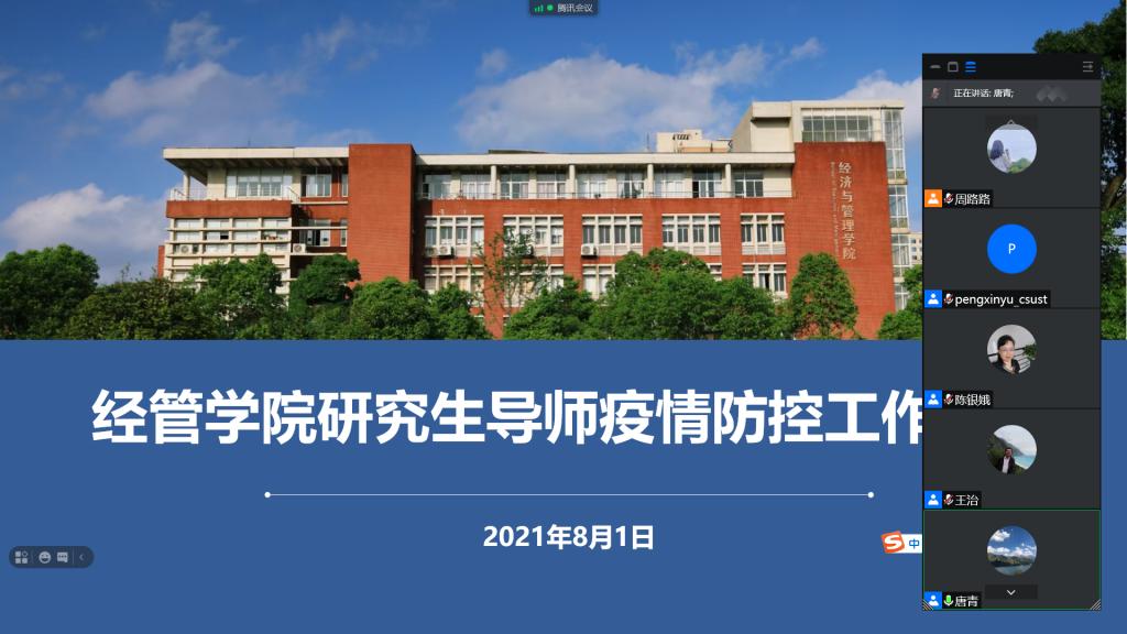 为更好落实学校疫情防控相关措施,维护暑假留校研究生的安全稳定,8月1日晚上7:30,经管学院召开了研究生导师疫情防控工作专题视频会议。院全体研究生导师参会,会议由院党委副书记唐青主持。